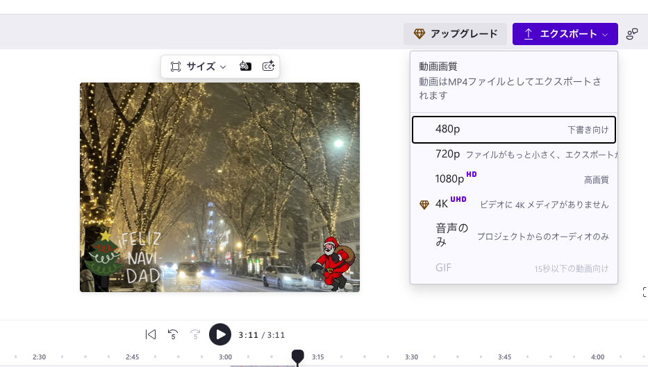 左記の画像のようにエクスポートをする時に高画質の4Kから下書き用とされる480pまで選択できますが、4Kの場合は有料です