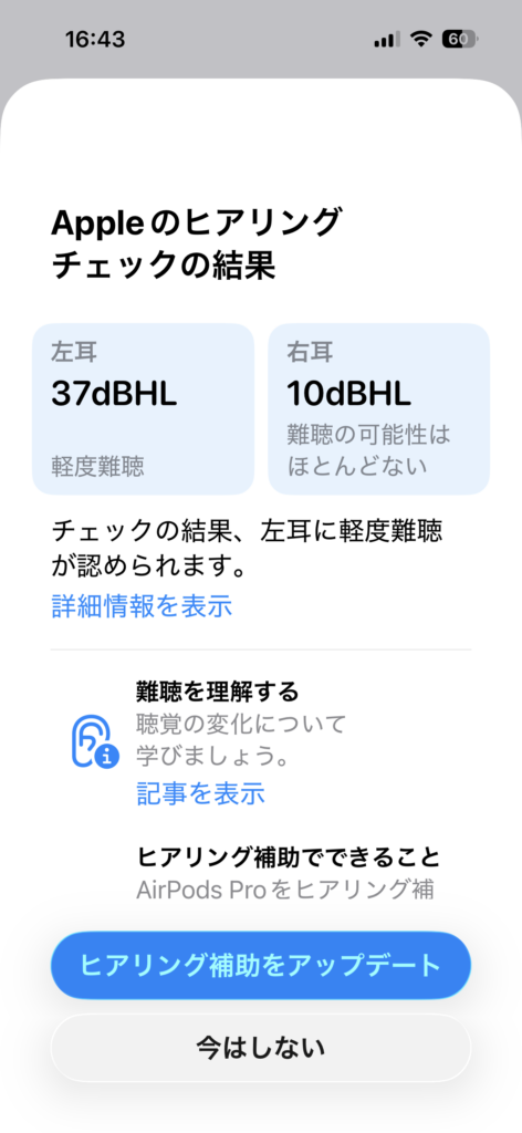 ヒアリングチェックの結果で、難聴の分類と推奨される次のステップが示されます。